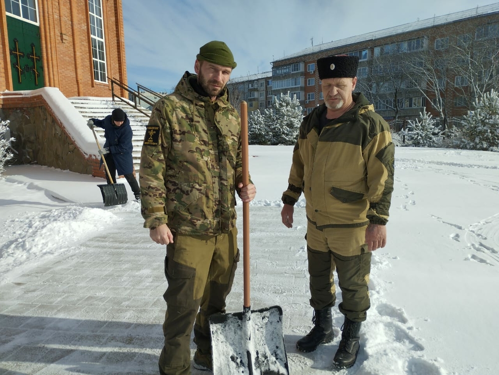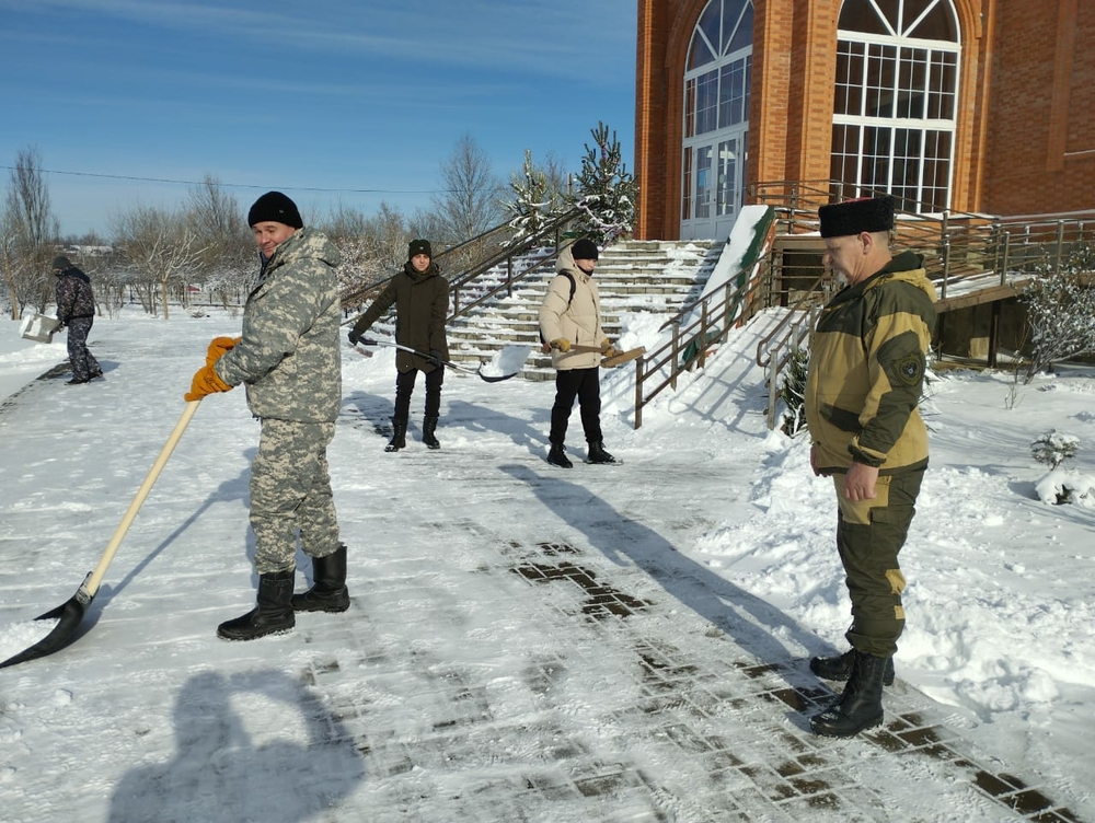 Казаки с казачатами ХКО "Гулькевичи " на территории Свято-Троицкого храма г.Гулькевичи наводили порядок, убрали снег возле храма.