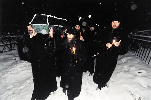Изнесение обретенных останков блаженной старицы Матроны из Даниловского кладбища. Полночь 8 марта 1998 года