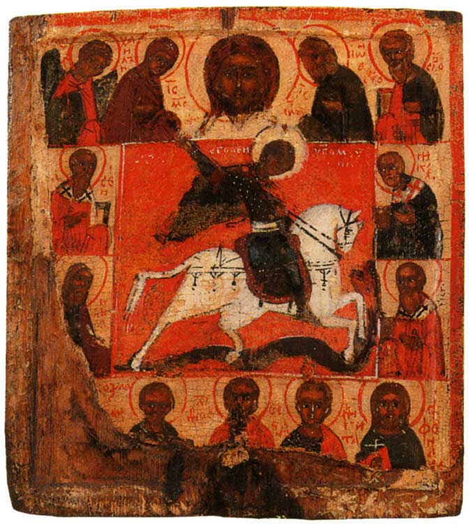 Чудо Георгия о змие, с Деисусом и избранными святыми. XVI в. Государственный Русский музей, Санкт-Петербург. Происходит из Георгиевской часовни в д. Шотогорка Пинежского района Архангельской области