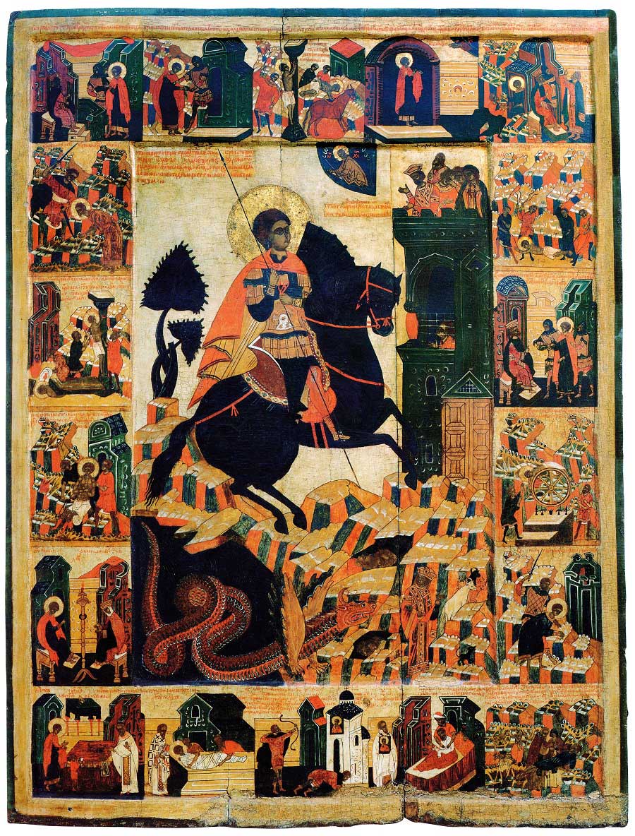 Чудо Георгия о змие, с житием в 18 клеймах. Вторая половина XVI в. Устюженский краеведческий музей, Вологда. Из собора Рождества Богоматери в Устюжне