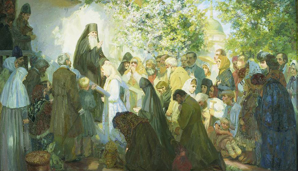 «Как на вершине горы сходятся все пути, ведущие туда, так и в Оптиной — этой духовной вершине — сошлись и высший духовный подвиг внутреннего делания, и служение миру во всей полноте, как его духовных, так и житейских нужд». К старцам в Оптину шли за утешением, исцелением, за советом… К ним шли те, кто запутался в своих житейских обстоятельствах или в философских исканиях, туда стремился тот, кто жаждал высшей правды, в этом «источнике живой воды» всякий утолял свою жажду. Выдающиеся мыслители эпохи, философы, писатели не раз и не два были там: Гоголь, Алексей и Лев Толстые, Достоевский, Владимир Соловьев, Леонтьев… — всех не перечесть. Ведь для русского человека старец — это человек, посланный Самим Богом. По словам Ф. М. Достоевского, «для души русского человека, измученной трудом и горем, а главное, всегдашней несправедливостью и всегдашним грехом, как своим, так и мировым, нет сильнее потребности и утешения, как обрести святыню или святого, пасть перед ним и поклониться ему. Если у нас грех, неправда и искушение, то все равно, есть на земле там-то, где-то святой и высший — у него, зато, правда. Значит, не умирает она на земле, а стало быть, когда-нибудь и к нам придет и воцарится по всей земле, как обещано».